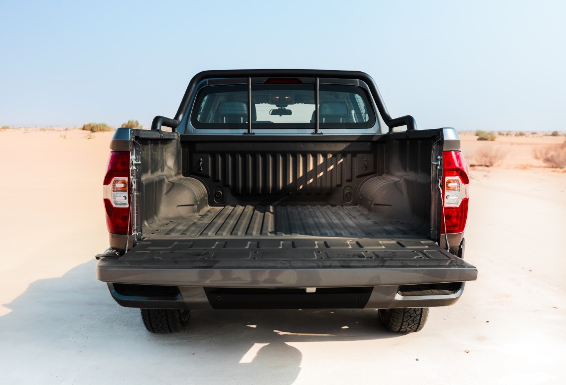 The bed features a robust construction with integrated rope hooks and an optional factory-fitted liner. At 1.48 meters long, it is deep enough to secure heavy machinery while remaining accessible for quick loading. Dimensions: 1485mm x 1510mm x 530mm Payload: Up to 1,050 kg depending on configuration.